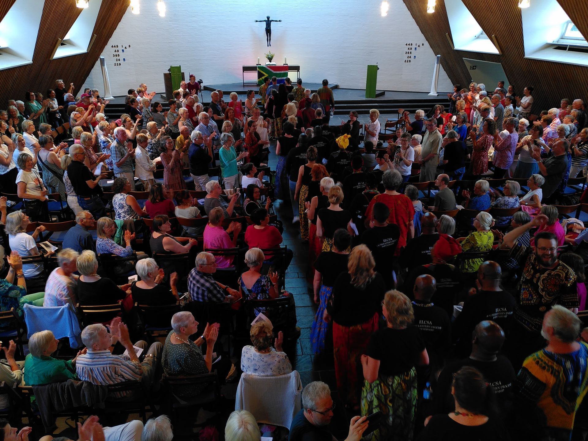 Die bis auf den letzten Platz gefüllte Kirche stand schon während des Einzugs der beiden Chöre und feierte begeistert mit, während mit dem Einzugslied „Siyhamba“ die einzigartige Stimmung eines afrikanischen Gospelkonzerts zu spüren war.